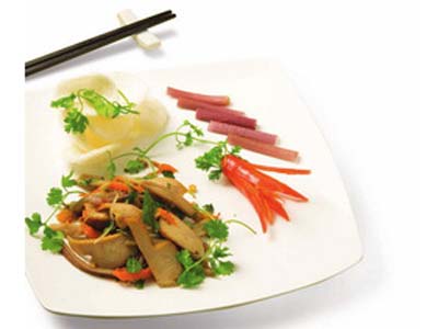 - Trộn đều các nguyên liệu với nước mắm gỏi, trang trí thêm ngò, bông ớt, ăn kèm bánh phồng tôm.