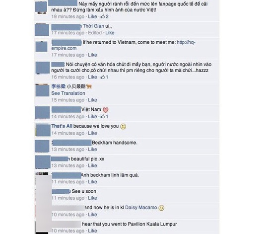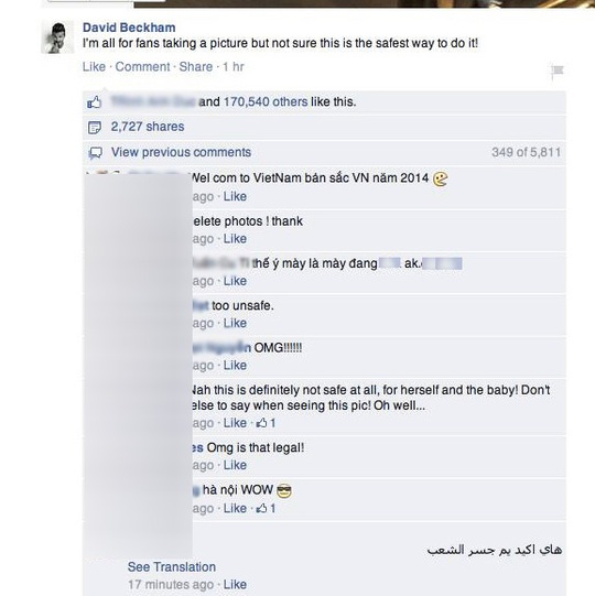 Nếu họ chỉ dừng lại ở việc tỏ thái độ không đồng tình với cách thể hiện tình cảm bất chấp sự an toàn của “fan” nữ kia thì cũng không đáng nói. Đằng này, tất cả lại cãi nhau loạn xạ bằng tiếng Việt, lên án rồi miệt thị người phụ nữ trong ảnh, đăng tải cả những câu chửi thiếu ý thức, thô tục. Họ biến Facebook của nhân vật nổi tiếng như David Beckham thành “bãi rác”, chiếm lĩnh trọn phần bình luận khiến ai cũng phải ngán ngẩm.