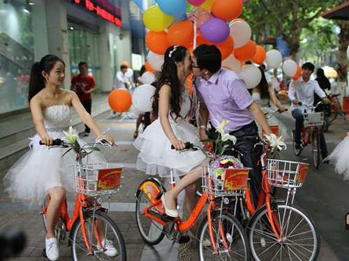 Rất đông người tò mò ngắm nhìn đôi bạn trẻ đạp xe đến khách sạn nơi tổ chức cưới ở thành phố Nam Kinh, tỉnh Giang Tô, phía đông Trung Quốc hôm 20-5.