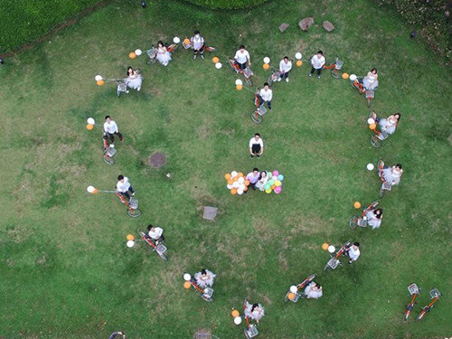 Cặp vợ chồng trẻ cùng các phù dâu, phù rể xếp thành hình trái tim bên những chiếc xe đạp của họ.
