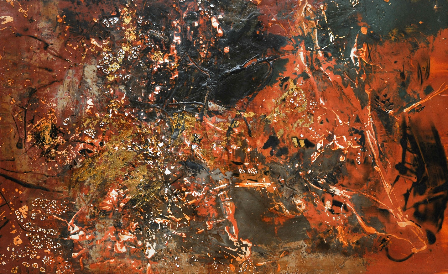 Trong kỹ thuật ấy, sự giằng co giữa hủy diệt và tái sinh trở thành động lực nội tại cho hình thức. Kết cấu bề mặt gợi cảm giác điêu khắc hơn là hội họa: ánh sáng không chỉ nằm trên mặt tranh mà len lỏi trong từng nếp gấp, khiến bề mặt trở thành một địa mạo cảm xúc. Ánh sáng quét qua bề mặt không còn đơn thuần là thị giác, mà mở ra những chiều sâu khác nhau: chỗ thẳm tối như vực, chỗ sáng rực như khoảnh khắc phun trào.