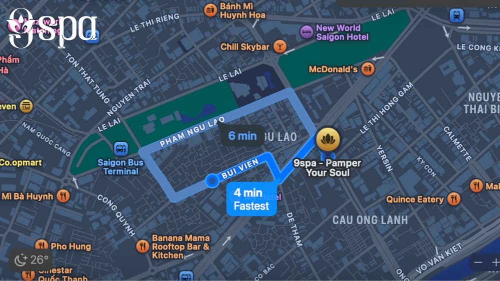 Vị trí thuận tiện: 9SPA nằm tại khu vực trung tâm, gần Ben Thanh Market, chỉ khoảng 5–7 phút di chuyển. Từ đây, du khách cũng dễ dàng tiếp cận các điểm tham quan nổi tiếng: